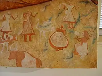 The name Pomo[, or Pomo people,] ... originally meant "those who live at red earth hole" and was once the name of a village in southern Potter Valley near the present-day community of Pomo.[5] It may have referred to local deposits of the red mineral magnesite, used for red beads, or to the reddish earth and clay such as hematite mined in the area.[6]