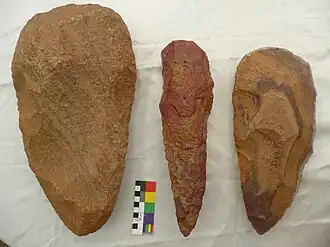 In the image at the right are apparent stone tools from the current sandy deserts of North Africa. On the left is a worked stone of 440 mm in length that comes from Libyan Erg Tamiset (latitude N25.25, longitude E10.52). On the right is a worked stone of 345 mm in length from Erg Murzuq in the Libyan southwest (N24.29/E11.59). The middle worked stone of 360 mm is a hand ax native to south Algeria, from the Erg Tiffemine (N26.29)/E06.49).