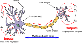 An ANN is based on a collection of connected units or nodes called artificial neurons, which loosely model the neurons in a biological brain. Each connection, like the synapses in a biological brain, can transmit a signal to other neurons. An artificial neuron receives signals then processes them and can signal neurons connected to it. The "signal" at a connection is a real number, and the output of each neuron is computed by some non-linear function of the sum of its inputs. The connections are called edges. Neurons and edges typically have a weight that adjusts as learning proceeds. The weight increases or decreases the strength of the signal at a connection. Neurons may have a threshold such that a signal is sent only if the aggregate signal crosses that threshold.