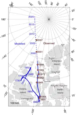 To conduct an experiment I am assuming that the projection on the right has been made to allow correct distances to be measured. I will use a millimeter scale and the file image on the file page to measure distances between pole points paired with dates and approximate locations.