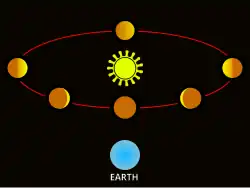 The diagram below to the right shows a 'top down' view of the earth-moon system, as seen from above the north pole. This model ignores that tilt of Earth's rotational axis, and assumes that the Earth, Sun, and Moon all lie in the same plane. Such a model would fail miserably in modeling eclipses, but serves quite well for understanding the monthly cycle of lunar phases.