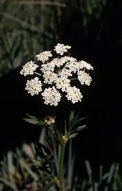 The inflorescence of white flowers is similar in appearance to many other species in the carrot family. It is a compound umbel with a many clusters of flowers.