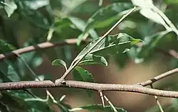 The leaves are alternate, 4-10 cm long and 2-4 cm wide, entire but with a waved margin they are silvery when they leaf out early in spring due to numerous tiny, scales, but turning greener above as the silvery scales wear off through the summer