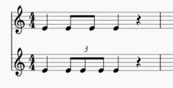 It is also possible to divide a note into 3 equal parts rather than 2 equal parts. A quarter note can be divided into 2 eighth notes (where each eighth note is half as long as the quarter note), but it can also be divided into 3 eighth note triplets (where each eighth note is a third as long as the quarter note). In order to notate this, a 3 is placed on the beam of the triplets to indicate that this is a grouping of 3. Both 2 eighth notes and 3 eighth note triplets take up the same amount of time, 1 quarter note. This triplet division can be done with other note values as well, a half note can either be split into 2 quarter notes or 3 quarter note triplets (in the absence of a beam, a bracket is placed over the 3 quarter note triplets with a "3" on it to indicate that it is a triplet). It's important to remember that creating triplets is dividing the note the same way it would divide in two, so you always notate a triplet as a subdivision of the note (a half note isn't split into 3 half-note triplets, it's split into 3 quarter note triplets, and those 3 triplets combined are as long as a half note).