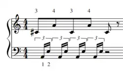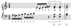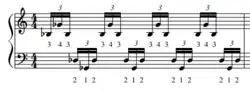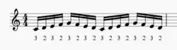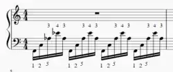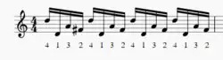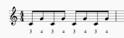 Triple lateral strokes are unique in the fact that they are a 3-note stroke. Triple lateral strokes occur when one hand quickly "see-saws" between two notes, and there are only 4 mallet combinations that can be triple lateral strokes (2-1-2, 1-2-1, 3-4-3, and 4-3-4). Similarly to double lateral strokes, at slow tempos this combination of mallets could be played as 3 separate single alternating strokes, but at high tempos it becomes a triple lateral stroke and is played with a smooth and connected rotating motion. As opposed to double lateral strokes though, it is typically easier to play triple lateral strokes from the inside-out (3-4-3) than it is to play from the outside in (4-3-4). In general triple laterals only use 2 unique notes, the repeated mallet doesn't change notes (as shown in Fig. 5), but some 4 mallet pieces do require the performer to change notes during the stroke, although it is more difficult. This technique is considered more of an advanced technique, and it is extremely difficult to do when held in a 2nd, especially in Burton grip.