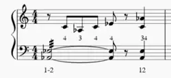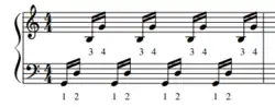 Double lateral strokes (as well as triple lateral strokes) are one of the most difficult types of strokes, and they occur when two mallets in one hand strike the board in quick succession (Either 1-2/2-1, or 3-4/4-3). Upon first look it may seem like double lateral strokes and single alternating strokes are the same (both strokes play 2 notes with the 2 different mallets in a single hand, either mallets 1/2 or 3/4), but the main difference between the two is tempo. At slower tempos, the sticking 3-4 can be played as single alternating strokes, where each note is a separate and defined motion, but at higher tempos, the sticking 3-4 is typically played as a double lateral, where the motion between the two mallets is a smooth connected roll-like motion. Another key difference is that single-alternating strokes can be played immediately after each other (such as in Fig. 3, where each mallet is played an eighth note after the other). Double lateral strokes, however, need a small amount of rest after being performed (such as in Fig. 4, where there is an eighth note of space between each 3-4 double lateral). This technique is very hard to do in smaller intervals (2nds and 3rds), especially in Burton grip, and generally it's easier for percussionists to to do this technique when it is initiated from the outside mallet as opposed to the inside mallet (4-3 and 1-2 is easier than 3-4 and 2-1).