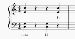 This is the most basic 4 mallet stroke, and the most similar to the stroke used when playing with 2 mallets. In a double vertical stroke, both mallets in the left or right hand strike the board at the same time (either mallets 1&2 or mallets 3&4). This allows a percussionist to play 2 notes at the same time with one hand, and the interval between the two notes can be as wide as an octave or as small as a second. Using double vertical strokes the keyboard can play 4 note chords, using a set interval in the left hand and set interval in the right hand. Keep in mind that it is hard to shift to "extreme" intervals (2nds and octaves) accurately, especially in Burton grip, so try to write chords that use 3rds, 4ths, 5ths and 6ths when writing for beginner/intermediate percussionists.