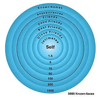 - ↑ Dunbar, Robin. Friends: Understanding the Power of our Most Important Relationships . Abacus. pp. 432. ISBN 978-0349143576., chapter 4
