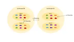 In ecology, alpha diversity (α-diversity) is the mean species diversity in sites or habitats at a local scale. The term was introduced by R. H. Whittaker[10][11] together with the terms beta diversity (β-diversity) and gamma diversity (γ-diversity). Whittaker's idea was that the total species diversity in a landscape (gamma diversity) is determined by two different things, the mean species diversity in sites or habitats at a more local scale (alpha diversity) and the differentiation among those habitats (beta diversity).