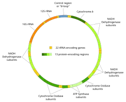 Mitochondrial DNA (mtDNA) is a circular double strand molecule which has a length of 15-20 kilobases in animals. In most species it has the same 37 genes that codify for 13 proteins, 2 ribosomal RNAs and 22 transfer RNAs (fig. 1).