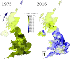1975—1990On 5 June 1975, the UK held its first national referendum, with the electorate asked to vote on the question: "Do you think the UK should stay in the European Community (Common Market)?" Every county and region returned majority "Yes" votes, apart from the Shetland Islands and the Outer Hebrides. With a turnout of just under 65%, the outcome of the vote was 67.2% in favour of staying in the EC.[6] Support for the UK to leave the EC in 1975, in the data, appears unrelated to the support for Leave in the 2016 referendum.[7] In 1979 the UK opted out of the new European Exchange Rate Mechanism (ERM) which was the precursor of the Euro. In 1985 the United Kingdom ratified the Single European Act, the first major revision to the Treaty of Rome without a referendum. In October 1990 – despite the deep reservations of Prime Minister Margaret Thatcher but under pressure from senior ministers – the United Kingdom joined the ERM with the Pound Sterling pegged to the Deutschmark. |