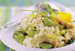 Risotto an nevezamzer gant keuz dañvadezDanvez evit 6 den: 150 g riz ront – 125 g a favennoù fresk – 8 asperjezenn – 1 penn-chalotez – 1 gourjetezenn – 75 g keuz dañvadez rasklet – 40 g parmesan rasklet – 2 galonenn artichaod dre eoul – 35 cl bouilhoñs legumaj – 15 g amann - pebr hag holen