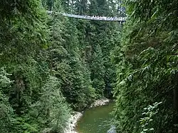Bridge with overhead cables supporting its roadway. One of the oldest of engineering forms, suspension bridges were constructed by primitive peoples using vines for cables and mounting the roadway directly on the cables.