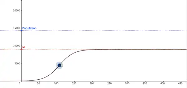 If we assume, that the logistical growth can be applied on COVID-19 disease, the point in time when the number of new detected cases do not increase anymore. This point in time can be estimated if and the point in the following graph.