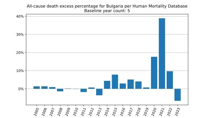 All-cause death excess percentage in Bulgaria, year by year, based on mortality.org data, stmf.csv[6]: