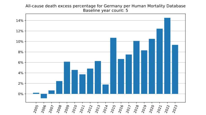 All-cause death excess percentage in Germany, year by year, based on mortality.org data, stmf.csv[21]: