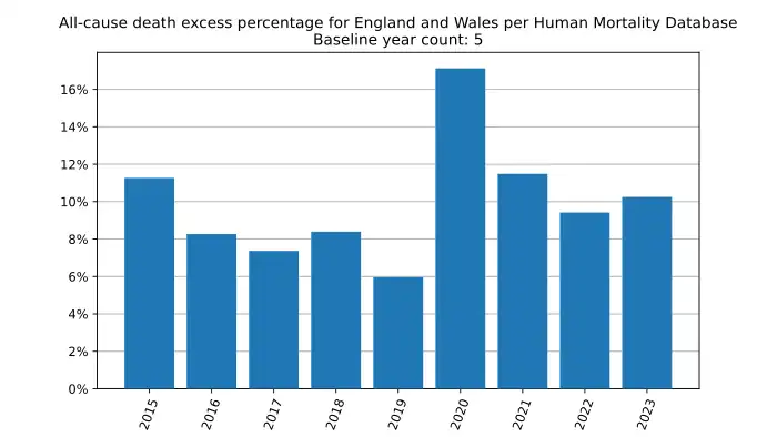 All-cause death excess percentage in England and Wales, year by year, based on mortality.org data, stmf.csv[16]: