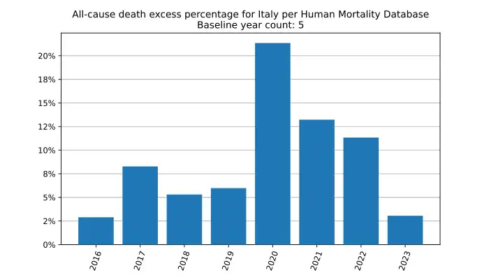 All-cause death excess percentage in Italy, year by year, based on mortality.org data, stmf.csv[26]: