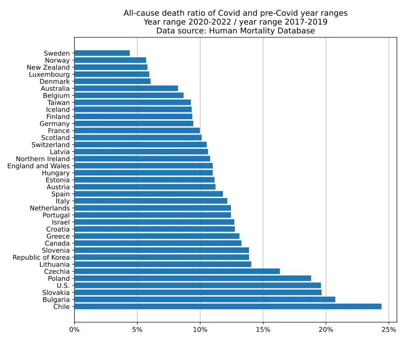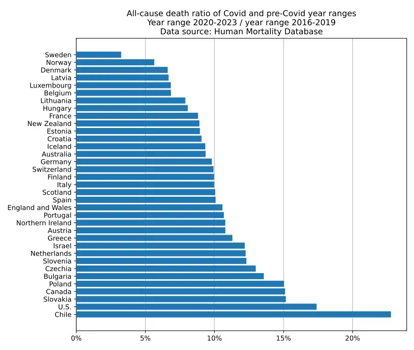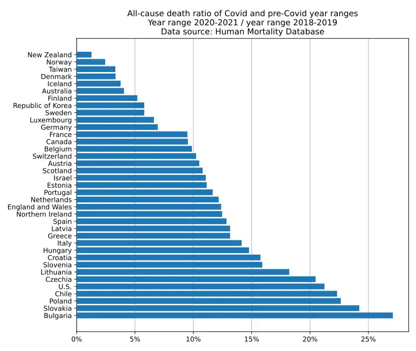 - The "dry tinder" effect can happen: a country will have very few excess deaths in the pre-Covid years and as a result more excess deaths in the Covid years, resulting in a higher ratio. In case of doubt, it is advisable to inspect all-cause death charts on a per-region basis.