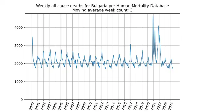 Weekly all-cause deaths in Bulgaria, based on mortality.org data, stmf.csv[2], 3-week moving average: