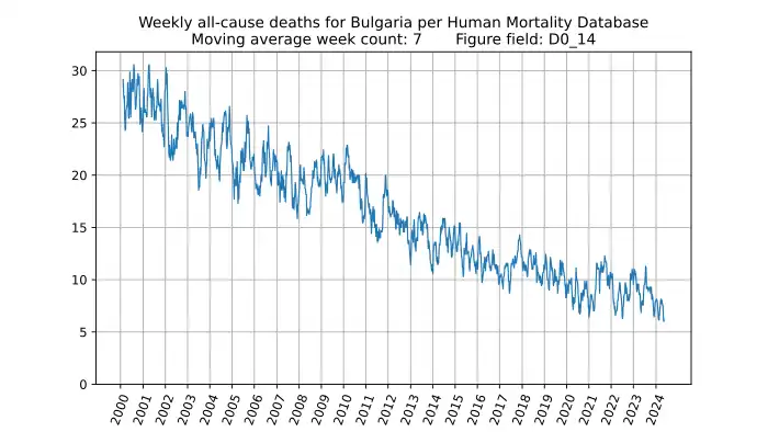 Weekly all-cause deaths in Bulgaria for 0-14 year olds, based on mortality.org data, stmf.csv[3], 7-week moving average: