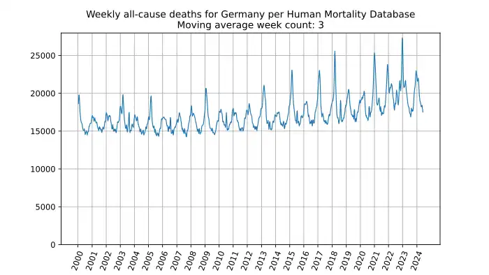 Weekly all-cause deaths in Germany based on mortality.org data, stmf.csv [17], 3-week moving average: