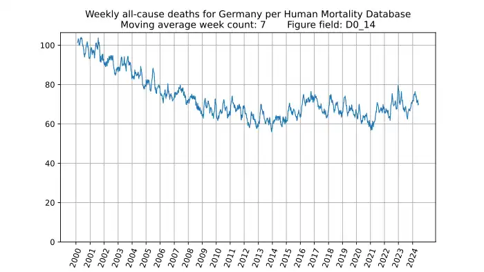 Weekly all-cause deaths in Germany for 0-14 year olds, based on mortality.org data, stmf.csv[18], 7-week moving average: