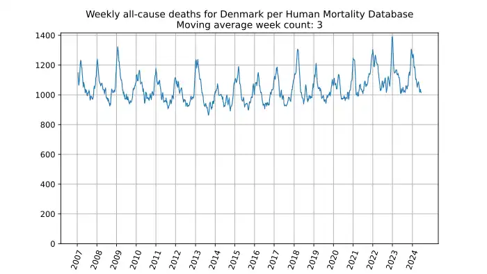 Weekly all-cause deaths in Denmark, based on mortality.org data, stmf.csv[7], 3-week moving average: