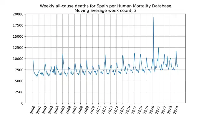 Weekly all-cause deaths in Spain, based on mortality.org data, stmf.csv[27], 3-week moving average: