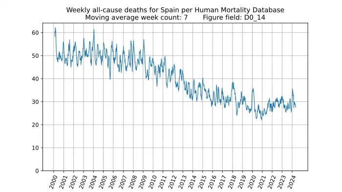 Weekly all-cause deaths in Spain for 0-14 year olds, based on mortality.org data, stmf.csv[28], 7-week moving average: