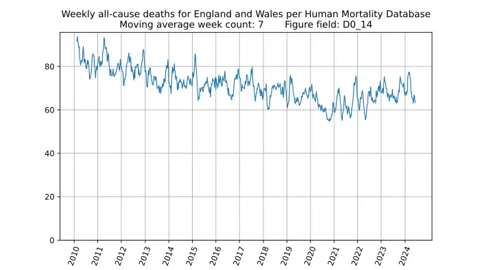 Weekly all-cause deaths in England and Wales for 0-14 year olds, based on mortality.org data, stmf.csv[13], 7-week average: