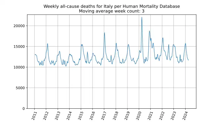 Weekly all-cause deaths in Italy based on mortality.org data, stmf.csv[22], 3-week moving average: