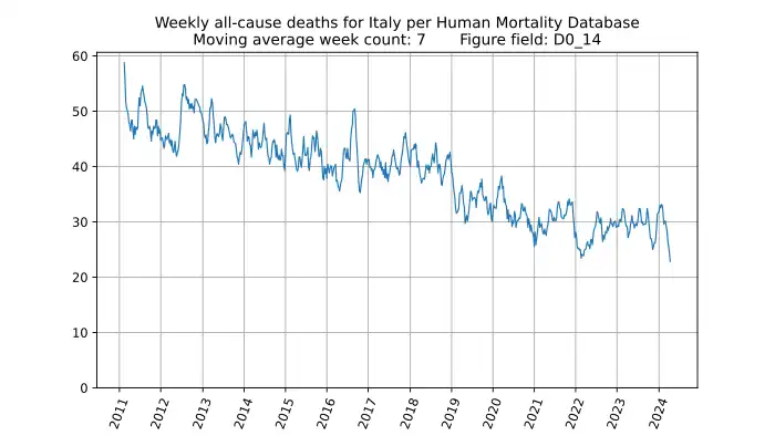 Weekly all-cause deaths in Italy for 0-14 year olds, based on mortality.org data, stmf.csv[23], 7-week moving average: