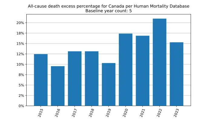All-cause death excess percentage in Canada, year by year, based on mortality.org data, stmf.csv[5]: