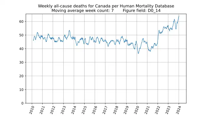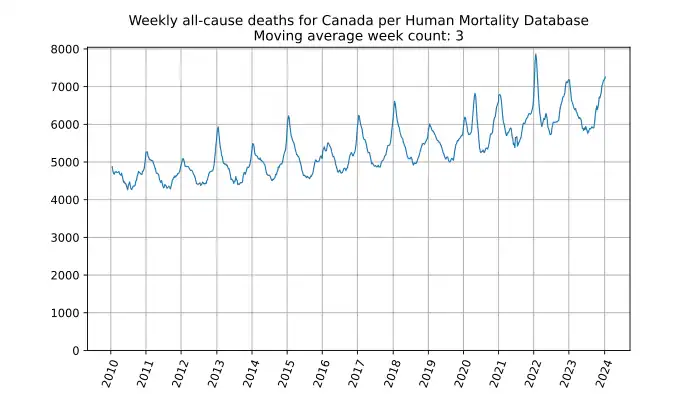 Weekly all-cause deaths in Canada, based on mortality.org data, stmf.csv[1], 3-week moving average:
