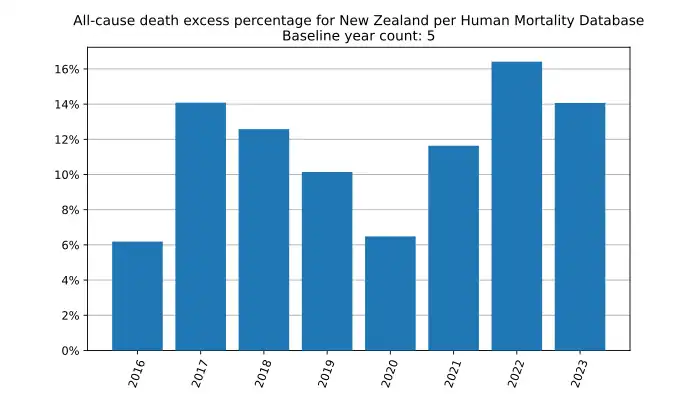 All-cause death excess percentage in New Zealand, year by year, based on mortality.org data, stmf.csv[5]:
