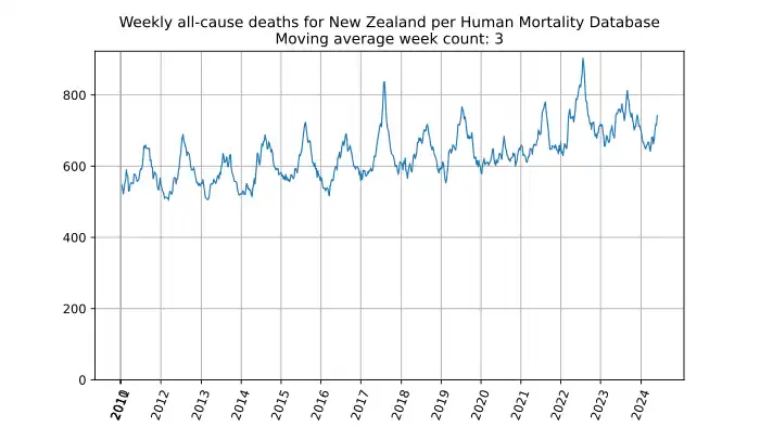 Weekly all-cause deaths in New Zealand, based on mortality.org data, stmf.csv[1], 3-week moving average: