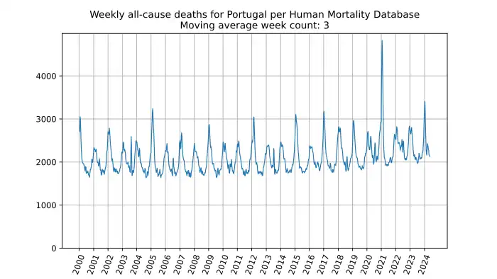 Weekly all-cause deaths in Portugal, based on mortality.org data, stmf.csv[1], 3-week moving average:
