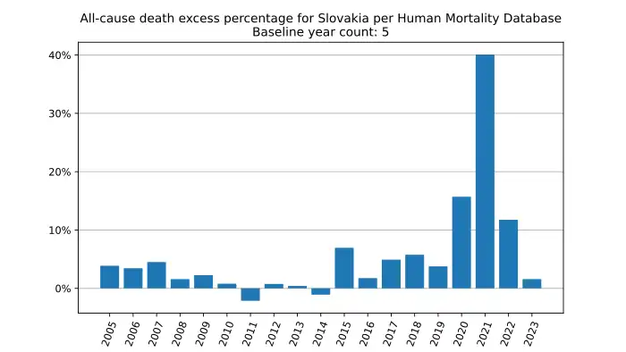 All-cause death excess percentage in Slovakia, year by year, based on mortality.org data, stmf.csv[5]: