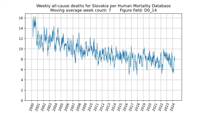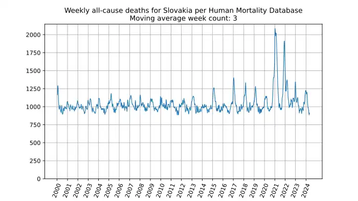 Weekly all-cause deaths in Slovakia, based on mortality.org data, stmf.csv[1], 3-week moving average: