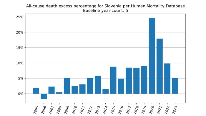 All-cause death excess percentage in Slovenia, year by year, based on mortality.org data, stmf.csv[5]: