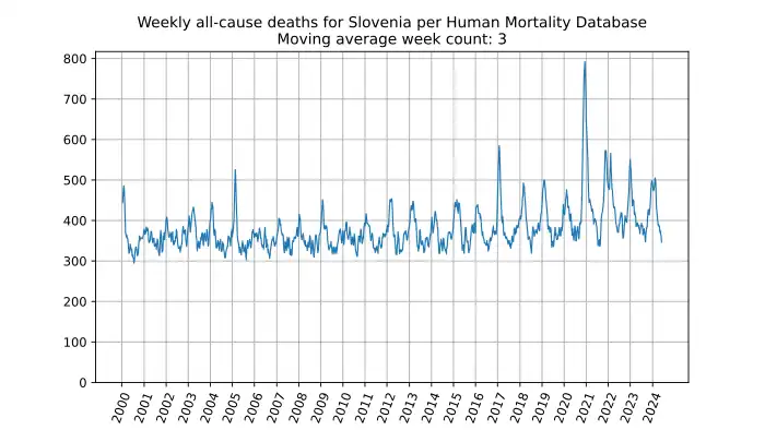 Weekly all-cause deaths in Slovenia, based on mortality.org data, stmf.csv[1], 3-week moving average: