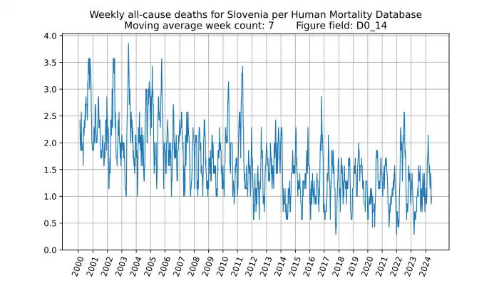 Weekly all-cause deaths in Slovenia for 0-14 year olds, based on mortality.org data, stmf.csv[2], 7-week moving average: