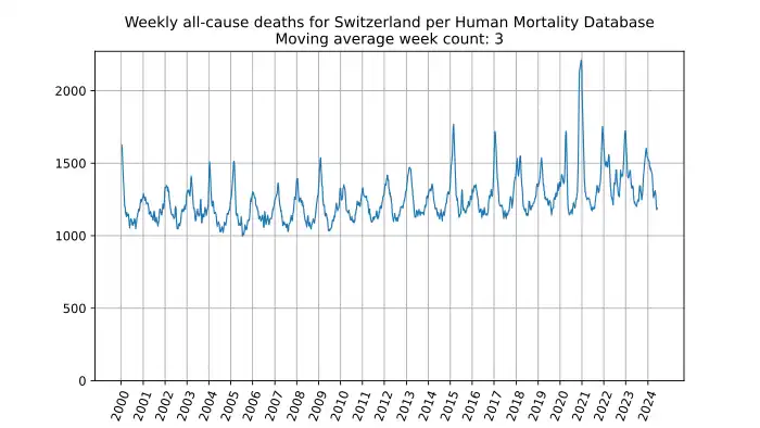 Weekly all-cause deaths in Switzerland, based on mortality.org data, stmf.csv[1], 3-week moving average: