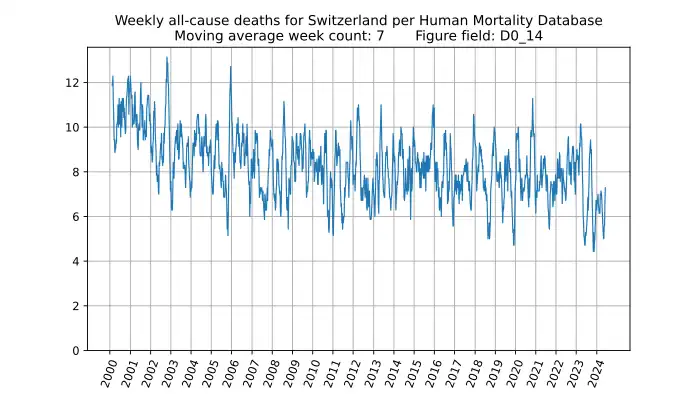 Weekly all-cause deaths in Switzerland for 0-14 year olds, based on mortality.org data, stmf.csv[2], 7-week moving average: