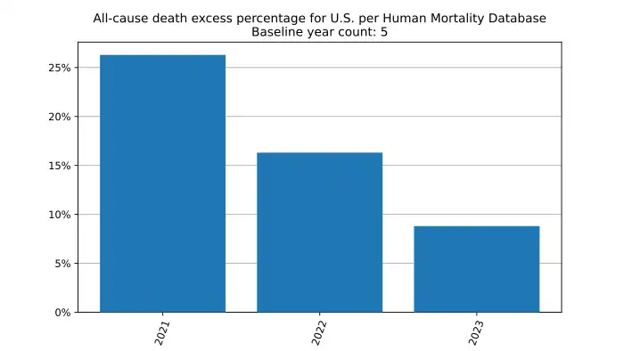All-cause death excess percentage in the United States, year by year, based on mortality.org data, stmf.csv[5]: