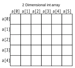 Multi-Dimensional ArraysArrays can be "multidimensional". A multidimensional array is exactly what it sounds like: an array that has been extended with increasing dimensions. For example, a 2D array will have 2 dimensions worth of elements that could be filled with data, forming a data structure that looks like a rectangular grid. A 3D array will have 3 dimensions of elements and form a data structure that looks like a rectangular prism. It should be noted that in C, technically, multidimensional arrays do not exist. A "multidimensional" array is merely an array that contains other arrays. In most cases, This fact does not impact programs. Multidimensional arrays have the same syntax as normal arrays. However, there are more array size declarators for the extra dimensions. data_type array_name[row_number][column_number][array_number]The Some actual C code for a 2D array definition would be as follows: int a[5][6]; // two dimensional array of height 5 and length 6