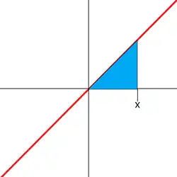 The integral is the math name for the math of areas under curves. To give an example, if you gave me a number, which I'll call x, I can give you the integral of y=x (the height, y is the same as the horizontal distance, x), which is the area of the blue triangle. Notice that the blue triangle is half of a square with side length x. This implies that the blue triangle's area is x*x/2, and thus, the integral of x is x*x/2.