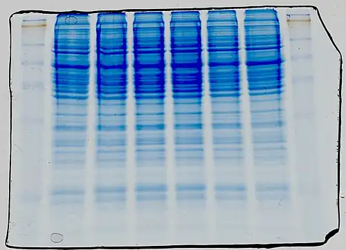 This is a technique that uses an SDS-PAGE. After the electrophoresis has run, the gel is turned upside down onto a piece of nitrocellulose filter paper. Electrophoresis is ran again at a perpendicular angle to to the gel, which causes the proteins to transfer into the paper. The paper is then placed into a buffer that has antibodies with fluorescence ability or radioactive particles. The paper is then exposed to UV light so the antibodies with fluoresce or exposed to x-ray sensitive paper. Additionally, the proteins can be tagged through many other markers. For more information see Western Blot.