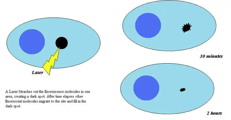 • This technique is very similar to the experiment above but can be monitored with a very specific rate. A laser is shined onto the cell membrane frying out the flourescent molecules but not damaging the cellular membrane. Immediately there is a dark area in the membrane but over time the dark spot goes away because the fluorescing and nonfluorescing proteins mix.